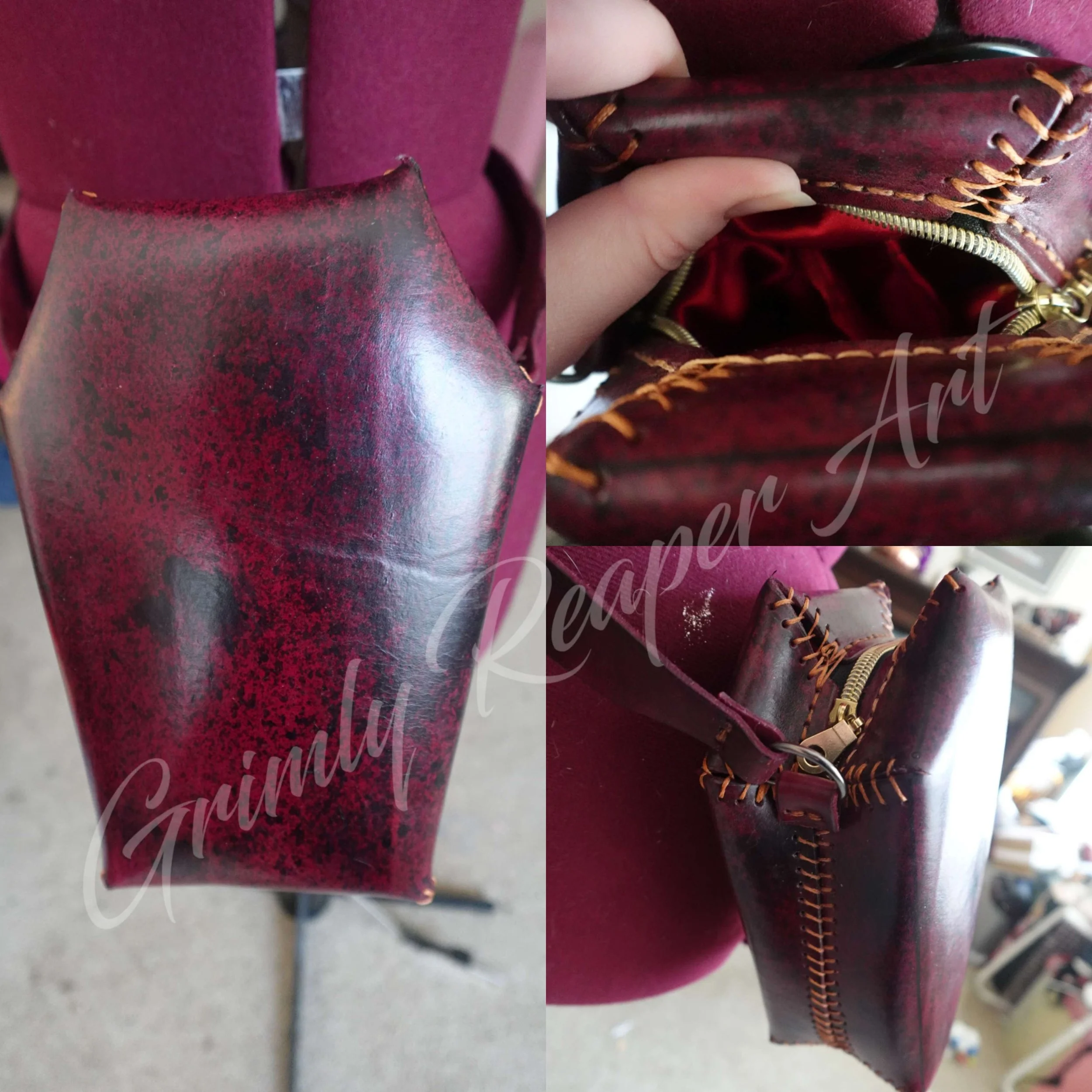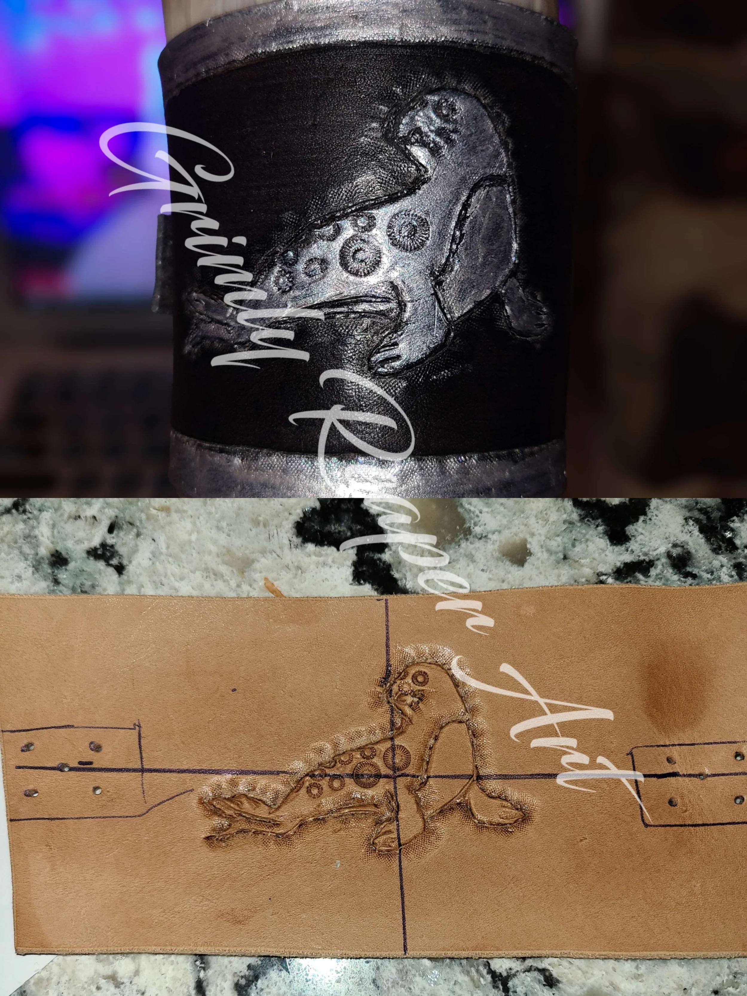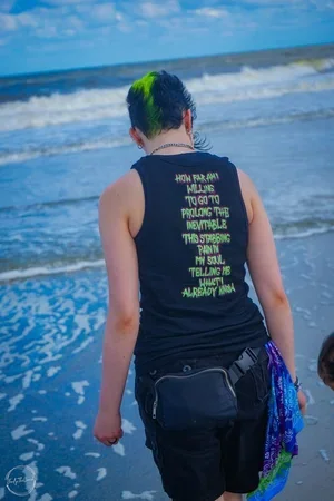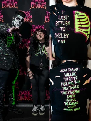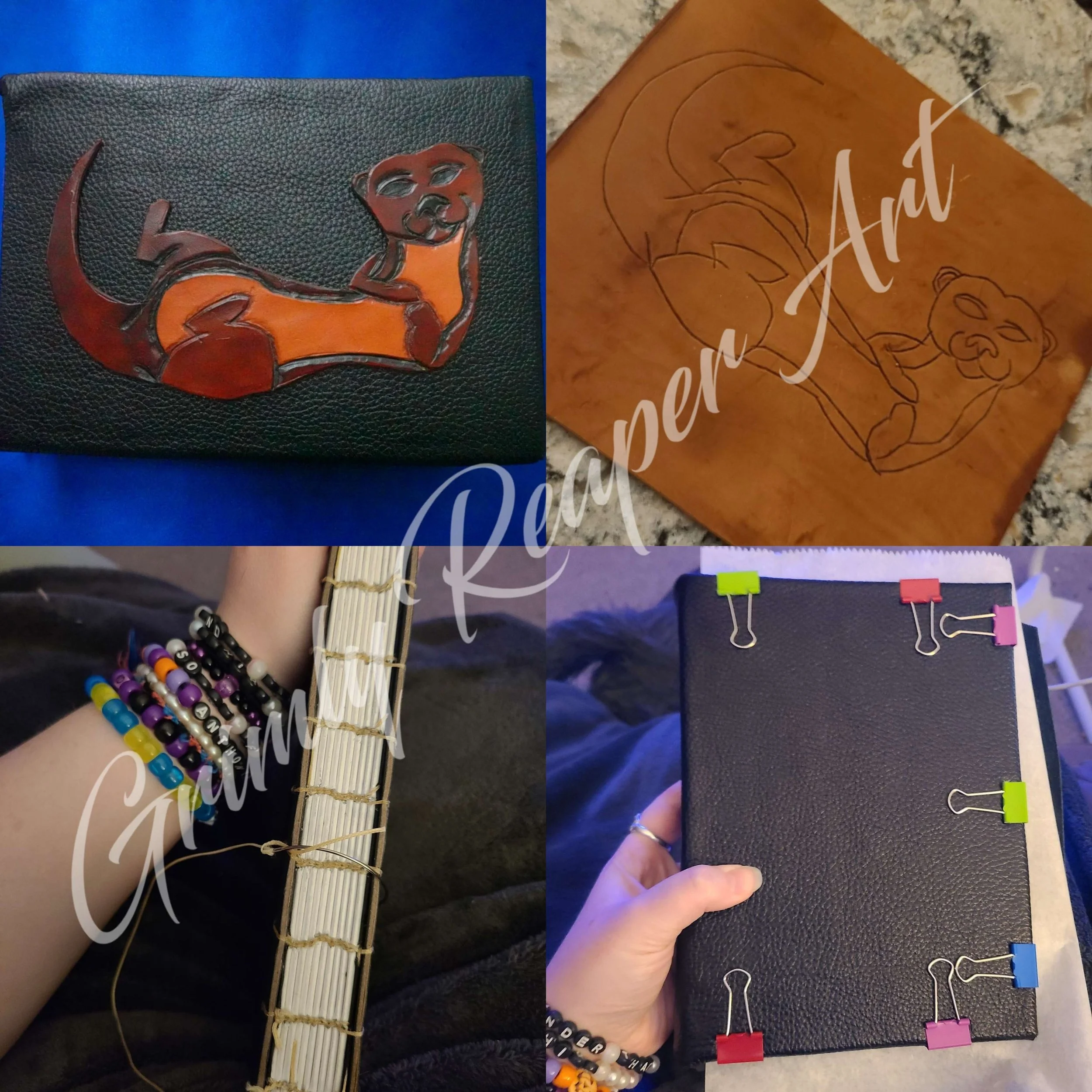 Select Works Design Sewing Metal mesh bodice with spandex and tulle train skirt Satin dress with crinoline and leather book Corset bodice with hand sewn detail, embroidered tulle skirt, and crinoline Corset made with purple/blue colour shift fabric and celestial mesh Leatherworking 2-3oz hand sewn leather bag with satin lining and custom splatter dye 2-3oz decorative carved leather strap for a drinking horn Chrome tan covered journal with 2-3oz veg-tan carving and coptic stitch binding Customization Custom stencil bleached cut off with splatter and hand made spiral chains for Triston Blaize Painted and distressed crop top for Taylor James Ricky Valentine in a painted tank topPhotographed by JordyTheConch